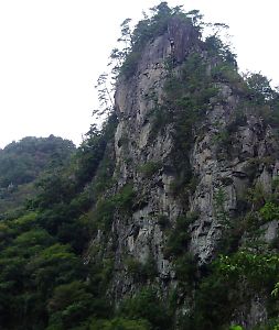 比叡山 白亜スラブルート 10月6日 午後は比叡に移動し最近出来た新しいルートの登攀である。 ネットで調べたら宮崎の水流渓人さんのHPにそれらしい記述があった。天空への階段ルート、てっきりこれだと思い会に提出した計画書にもそう書いていた。 が、MはやはりそのHPを見てすでに登ったそうで、そして渡された目的のルート図にはZ−、Y+、Z−、...ヒエー登れるわけがない!!。 取り付きで実際の壁を見て、やっぱ無理、絶対無理と心でつぶやきながら上部に目をやるとなにやら動く姿がある。先行パーティーだ。 今年になって陶以外の岩場にも何度か行く機会を得たが他のパーティーに出会うのは初めてである。我々の声に気づいたようで互いに手を振って挨拶。 だが、これで更にプレッシャーがのしかかる。「まずい、ぶざまな格好は見せられない」。 1Pは草付きを右上するがほとんどアプローチで問題はない。だが眼下にはおそらく100mくらいの高度差で網の瀬川の河原が真下に見え既に何ピッチか登ったような高度感が感じられる。 2Pはレイバックが良く効く、が難しい。たまにヌンチャクを持ったりピンに足をかけたりでなんとか攀じ登る。いつも思うが初めてでこんな難しいピッチを良くリード出来るものである。 3PはY+なので易しくはないのだが、2Pで難儀しただけにかなり楽に感じる。傾斜も少し緩くホールドスタンスも結構ある。もちろん2Pに比べればではあるが。いつものようにちょっと苦しくなるとすぐヌンチャク持ちの、ピンスタンスありのでとにかく必死で攀じる。途中持ったフレーク状の岩は少し浮いている感じだった。新しいルートなのでまだ不安定な岩も残っているようだ。 3P終了点でMが先行パーティーに追いつく。 先行パーティーのトップ氏はだいぶ前から4Pに取り付いていてA1ルートをA0で頑張っているようだが、苦労していたようだった。続いてセカンド氏がA1で取り付く。どうやら先行パーティーのセカンド氏は自分とそれほど差はないようでホッとする。 セカンド氏が4Pを登り始めてほどなく自分が3P終了点に到着し確保点に最後の一登りと右手を掛けた一抱えもある岩がグラッ!...あっ、...次の声が出ない。ものすごい音とスピードで落下していく。先行パーティーからは見えないが事故?!と思い声があがる。下にパーティーがいたらおそらく命はない。しばらく放心状態。安定した岩ばかりの陶とは訳が違うようで勉強になった。