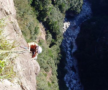 終了点にはMだけでなく先行パーティーもお先にどうぞと待っていた。狭い終了点は大混雑となった。先行パーティーはHPの主の水流渓人さんと小松の親分さんのパーティーであった。水流さんはさかんに「速いですね」を連発する。悪い気はしないが、もちろんMに対する言葉である。 最終ピッチはX+級で自分にとって易しいと言えるグレードではないのだが、2〜4ピッチに比べればなんでもない。やっと余裕のあるクライミングを味わうことが出来た。 終了点からは踏み後をたどるか懸垂で降りるかだが、左方カンテルートを50mほぼいっぱいの懸垂を三回して取り付きの近くに降りた。 見上げた岸壁はそそり立ち、ついさっき登ったことの実感がわかない威圧的な姿を見せていた。