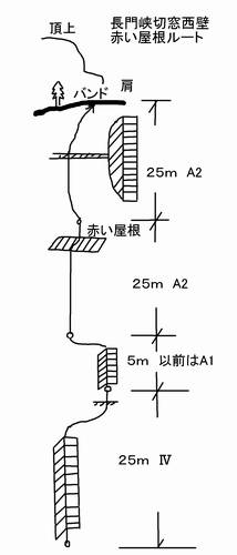 いつものようにMが取り付く。たまにフーー!っと大きな息を吐く。スムーズに登っているがそれでもかなり緊張するピッチの様だ。ジェードルを越えると少しハングした壁を越えて1P終了。 さて自分の番である。レイバックスタイルで右の壁を足で突っ張ればよさそうだが、岩は苔が着いていたりで足のフリクションは弱く滑りそうで思い切れない。しばらく苦闘するがプロテクションのスリングになんとか手が届いたのでこれを頼りに木を掴みなんとか越えた。次の少しハングした1m程の壁はヌンチャクを掴むがそれでも難しく、ロープを掴みやっと1P終了。チョンボばかりでもすでにアップアップ状態。 2Pは同じようなジェードルでクラックが走るがホールド感がどうも甘い。手を入れてハンドジャミングでなんとか体勢を維持し左へトラバースしバンドに登る。 1Pに比べると少し易しいとは思ったが、昔はA1だったのだがハーケンがなくなりフリーとなっているとの事だった。ここはフリーの方がおもしろいとはMの弁だが、自分はおもしろくなくてもA1がいい。 次はいよいよA2の登場。Mの登る姿を見ているとなんとかなりそうに思うが、実力差を考えれば安心してはいけない。今まで何度騙されたことか。 最初の垂壁はA1でこれは問題ない。さていいよいよA2の登場である。壁から1m以上水平に天井が張りだしその先あたりにボルトがある。これにあぶみを掛けぶら下がり天井外側の壁にあるボルトにあぶみを掛け乗り移らなければいけない Mに言われレストフィフィをハーネスに取り付けてきたが、掛けようとするがこれが短かすぎたようでなかなか掛けられない。仕方ないので左手であぶみの上部を持ち右手でもう一つのあぶみを掛けようとするが微妙に届かない。しかも手であぶみを持つと足が大きく反対側に振れますます腕の負担が大きくなる。何回か挑戦したがどうにもならないので、壁のボルトからぶら下がるヌンチャクに掛ける。が、すでに腕はパンパン。ロープで確保はされているが落ちる恐怖が全身を包む。結局腕力尽きギブアップ。ロープにぶら下がり空中をズルズルと降ろしてもらう。まさに「敗退」という言葉がよく似合う姿だ。自分が登れないことでMも最後のピッチは断念となる、申し訳ないやら情けないやら。 Mによると、あぶみは「作業」とのこと。つまり岩登りのセンスというより手順、やり方をおぼえれば難しくはないとの事。なら自分でも出来るかもしれないと少し気持を立て直した。家の車庫の梁にぶら下がり練習でもするか... 案外めげないのである。