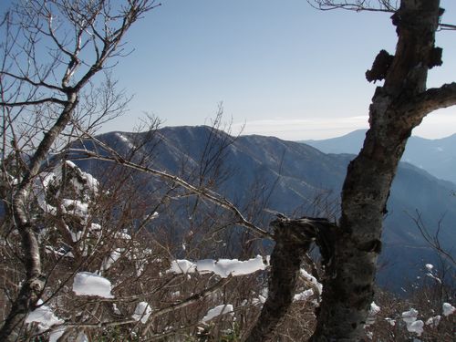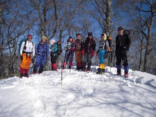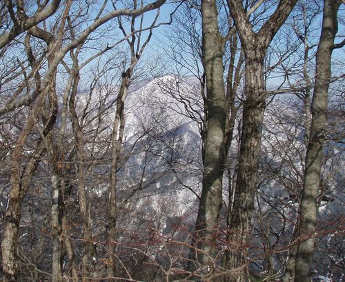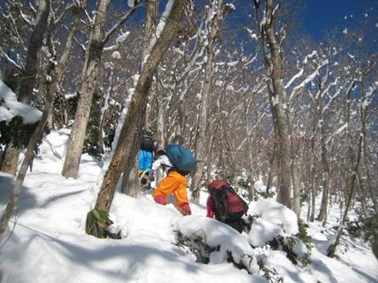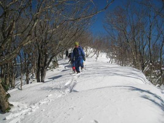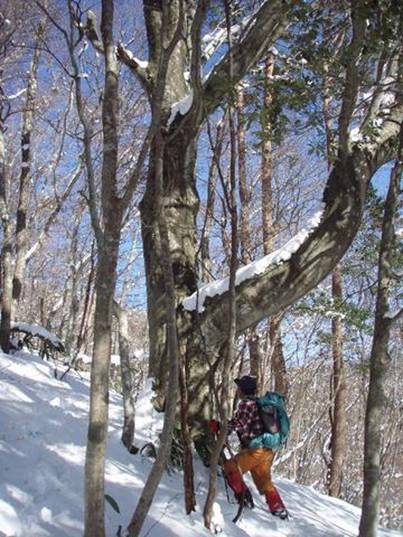神社の前に車を置く。珍しいよそ者がたくさん来たせいか、犬がけたたましく吠え立てる。 神社の裏から取りつく。雪はわずかで、ちょっと期待外れ。笹藪の急斜面に続き、林道を渡ると今度は植林の急斜面が続く。中途半端な積雪が歩き難い。Tomoが珍しくしんどうそうと思ったら、7Kgの水を余分に入れボッカ訓練だった。 植林が続きこの尾根ははずれか!、と思ったが平坦な地形が現れた辺りで周囲は一変、自然林に包まれたすばらしい尾根になった。少し登るとブナの大木にも出会う。快晴の青空が雪と木々を引き立てる。
